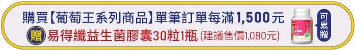 單筆訂單每滿1,500元,贈送 「葡萄王易得纖益生菌膠囊30粒1瓶」(建議售價1,080元)。