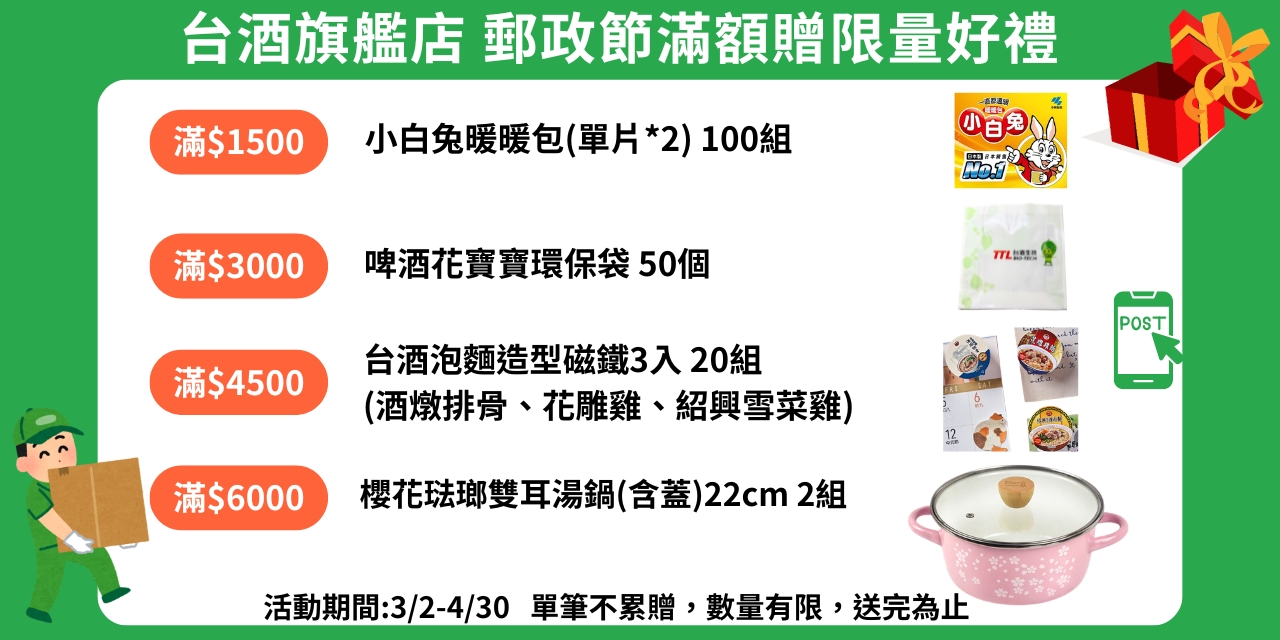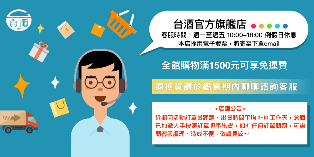 台酒i郵購直營店,提供美味、健康商品,麵食/餅乾/保健/美妝/清潔/生活用品一應俱全。 響應環保永續節能政策,本店採循環包裝,並全面採用“電子發票" 不隨貨附紙本發票, 請於結帳時填寫電子發票資訊(抬頭、統編),收到商品1個工作天寄至下單email , 若有任何問題建議使用網頁上方"聯絡我們"協助您快速處理,謝謝